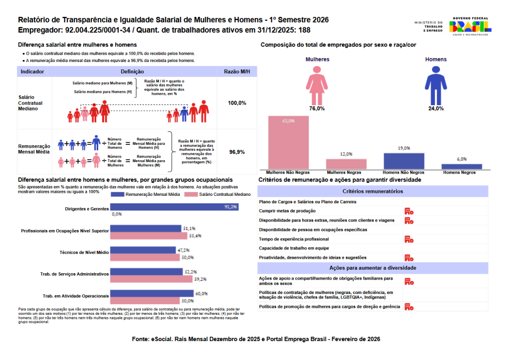 Confira a seguir o Relatório de Transparência e Igualdade Salarial de Mulheres e Homens – 1º Semestre 2026: